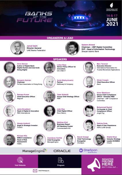 ويهدف هذا المؤتمر إلى استقطاب قادة الفكر العالمي المتميزين عبر جميع القطاعات الرقمية والتكنولوجيا المالية وخبراء الامتثال وأمن المعلومات لعرض التقدم الرئيسي في المجالات التي تبلور "بنوك المستقبل" في النظام المصرفي في دولة الإمارات.