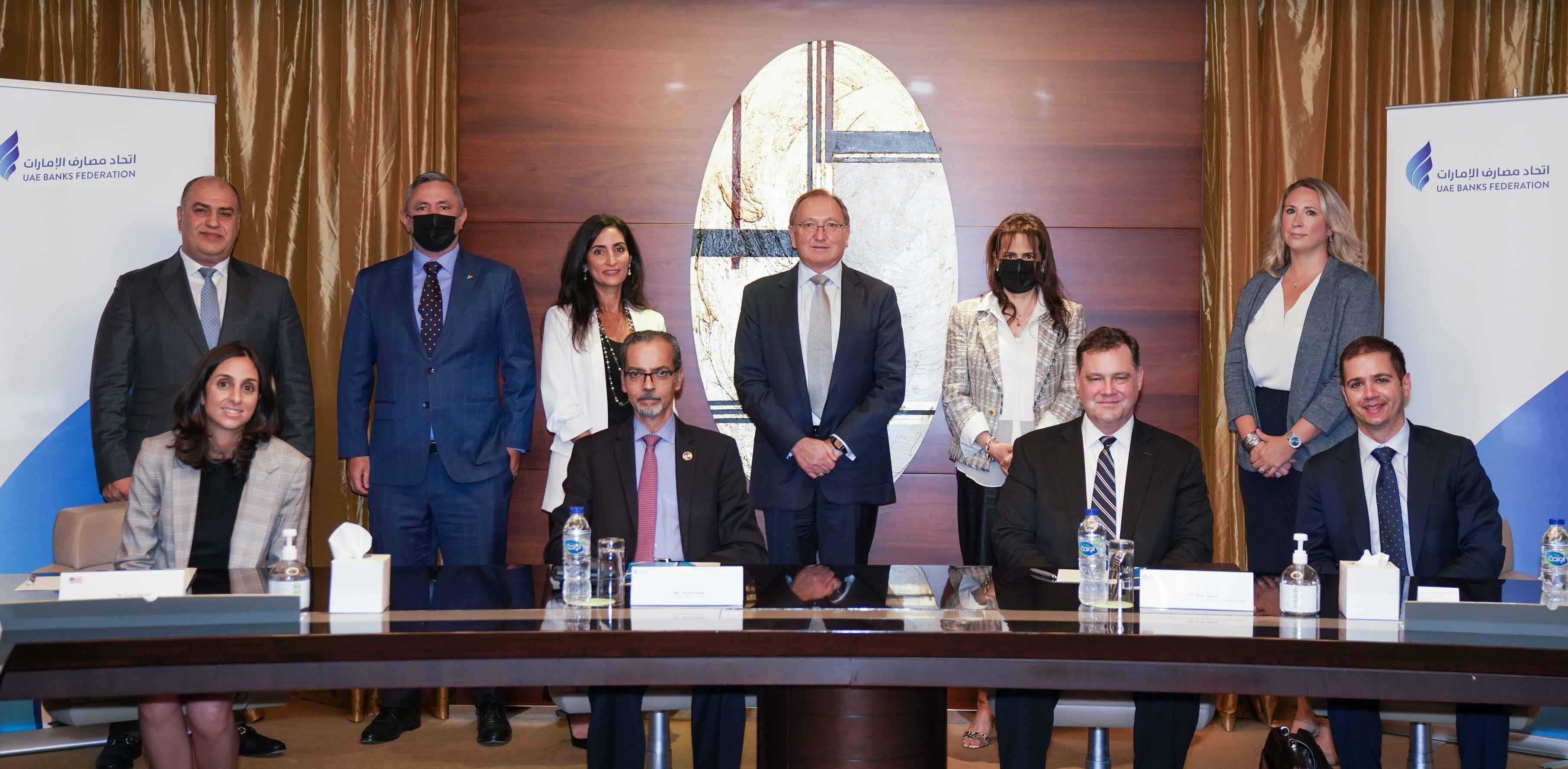 أبوظبي، 1 يوليو 2021: عقد وفد رفيع المستوى من لجنة الامتثال التابعة لاتحاد مصارف الإمارات، برئاسة السيد جمال صالح، مدير عام اتحاد مصارف الإمارات، اجتماعاً رسمياً مع السيد بول أهيرن، القائم بأعمال مساعد وزير الخزانة نائب مساعد الوزير لمكتب تمويل الإرهاب والجرائم المالية، وذلك لمناقشة عدد من القضايا المتعلقة بالامتثال للجرائم المالية، بالإضافة إلى تسليط الضوء على التقدم الملحوظ فيما يتعلق بالإجراءات الخاصة بمكافحة غسيل الأموال وتمويل الإرهاب.